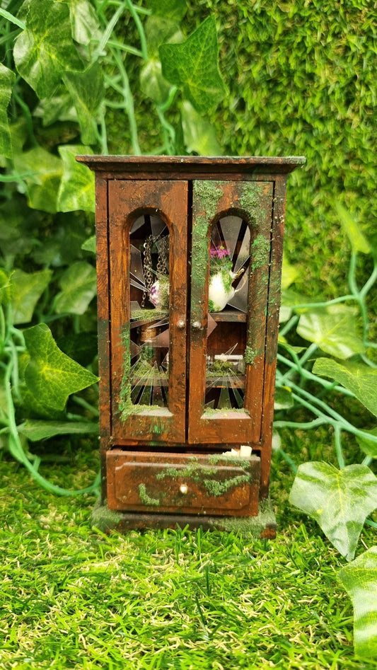 Miniature abandoned display cabinet 1:12 scale dollshouse minature shelves with moss, butterfly bottle and secret books with key