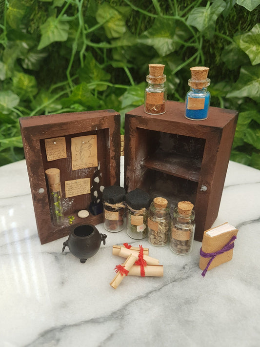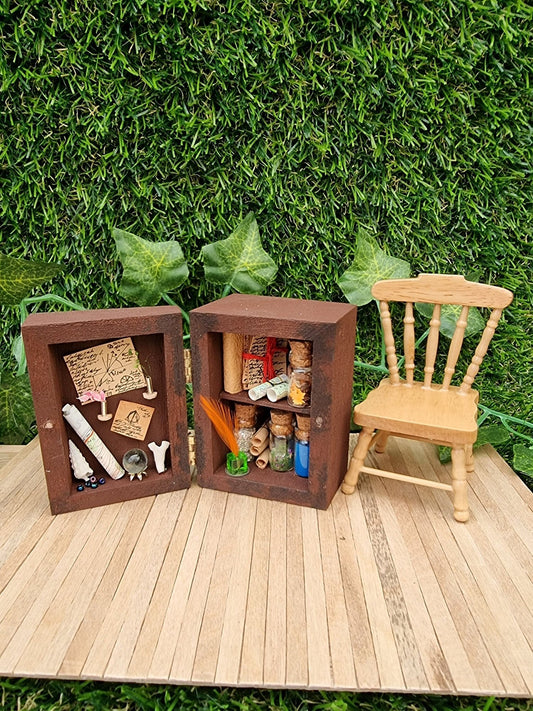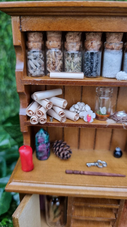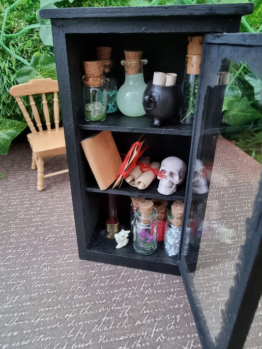 Dollhouse miniature dresser 1:12th scale apothecary curio cabinet for miniature potions with cauldron and wand