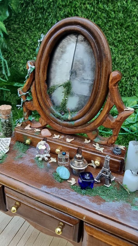 Miniature abandoned dressing table 1:12 scale dollshouse miniature dresser vanity drawers with mirror and ivy handmade dollhouse furniture
