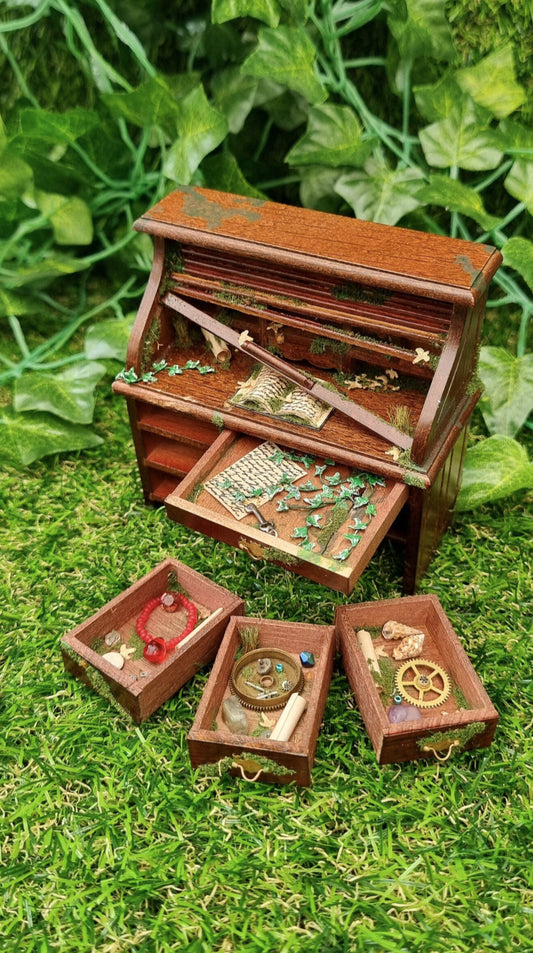 Miniature abandoned roll top desk 1:12 scale dollshouse miniature desk with drawers, book, creeping ivy and secret drawer with key